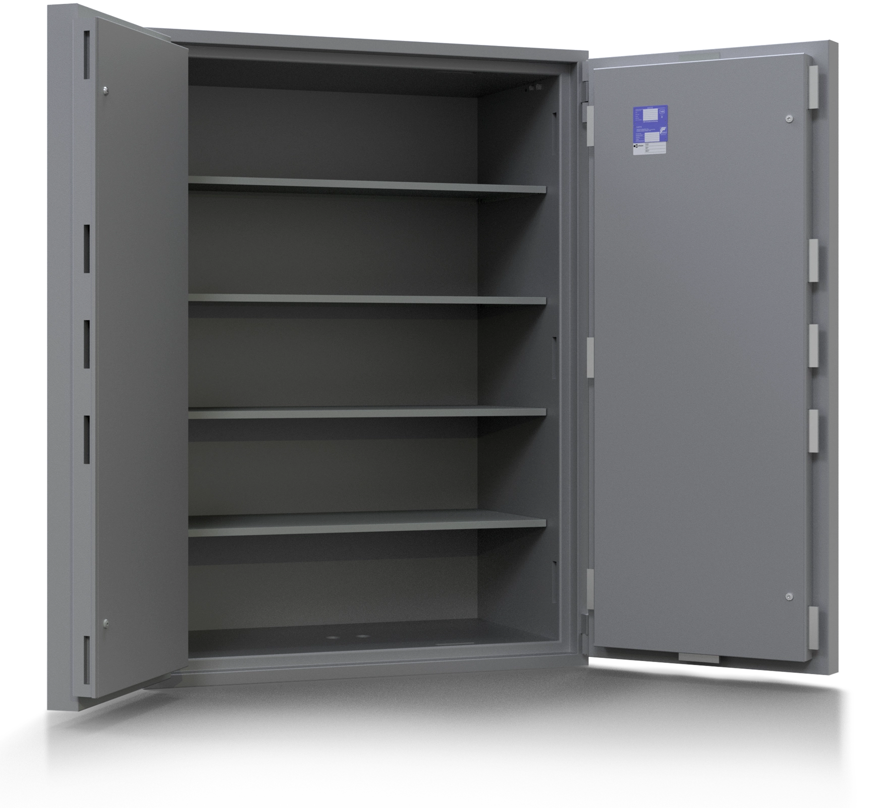 Optional kann das Türband noch weiter außenliegend bestellt werden, sodass bereits bei einem Öffnungswinkel von 90° die volle Innenbreite des Tresors genutzt werden kann. Dies ist besonders praktisch, wenn Sie zusätzliche Innenausstattungen wie Schließfächer bestellen.