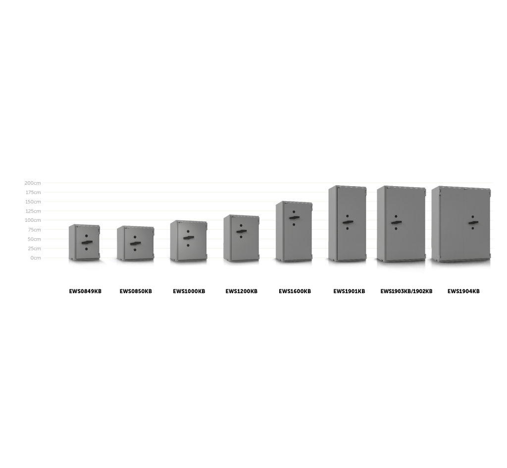 Die Modelle EWS0850KB, EWS1000KB, EWS1200KB, EWS1600KB, EWS1901KB & EWS1903KB verfügen standardmäßig über einen zertifizierten Brandschutz von 30 Minuten (LFS30) und können optional mit einem Feuerschutz von 60 Minuten für Papierdokumente (LFS60) bestellt werden.